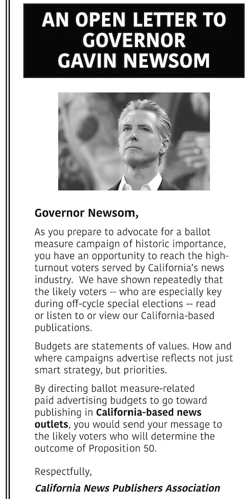 The ad, titled “An Open Letter to Governor Gavin Newsom,” described newspaper readers as “high-turnout voters who will determine the outcome of Proposition 50.” CNPA represents more than 400 news outlets statewide, including The Los Angeles Times, The Sacramento Bee, and The Press-Enterprise.